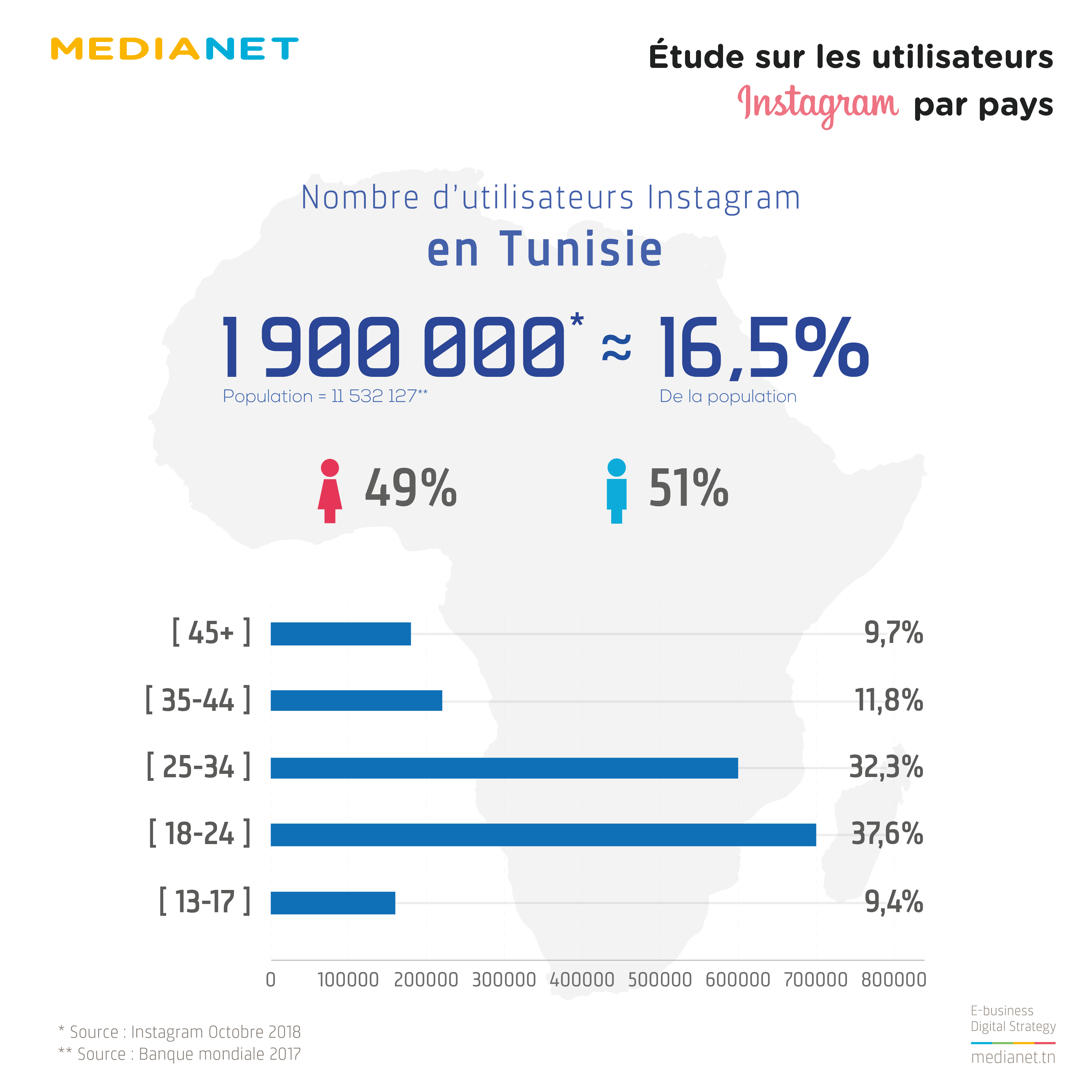1 900 000 tunisiens sont connectés sur Instagram, soit 16.5% de la population. 51% des utilisateurs tunisiens d’Instagram sont des hommes, 49% sont des femmes.